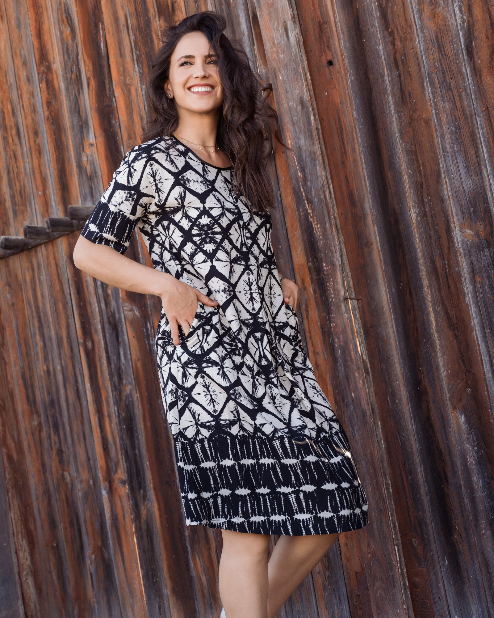 Introducing The Luna – a sophisticated addition to your wardrobe. With its intricate monochrome geometric print. The relaxed fit and mid-length hem make it perfect for any occasion, whether you're wandering through the city streets or dancing under the stars. The Luna is crafted from soft, breathable fabric, ensuring you feel as good as you look. Slip into this effortlessly chic piece and let your unique style shine.